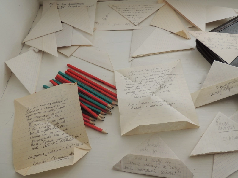 В эти майские дни, главной темой таких писем стали слова благодарности от потомков к солдатам за добытую Победу, за мир и жизнь. Вот некоторые фразы из писем: «Дорогой солдат. Спасибо, что сражаетесь за нас, за мирное небо. Мы вас никогда не забудем. Спасибо за все! Вы самые гордые, мужественные! Вы герои!», «Дорогой солдат! Спасибо тебе за все, за то, что ты воевал. Я тебе очень благодарна и не только я, много людей», «У меня в 1941 году пропал прадедушка. Я хотела ему сказать, что я его очень люблю и горжусь им. Спасибо, что воевал за нас, за Родину, за светлое небо! Я очень надеюсь, что я наша семья найдет информацию о вас. До свидания! Дарья, 12 лет», «Дорогой солдат! Я благодарю за то, что ты сражался за свою Родину. Воевал, боролся, попадал в плен, терпел боль. Я пишу тебе письмо, чтобы поблагодарить за твое мужество, храбрость, терпение!».