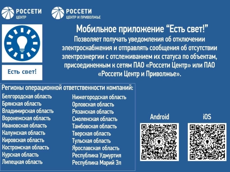 Установить приложение «Есть свет!» можно через магазин приложений мобильного устройства Google Play или App Store, воспользовавшись поиском, а также перейдя по ссылкам или отсканировав QR-код.