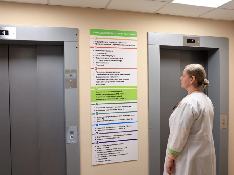 Восьмиэтажное здание общей площадью почти 21 тысяч кв. м включает стационарные отделения хирургического и химиотерапевтического профилей на 175 круглосуточных коек, а также поликлинику с диагностическими подразделениями.