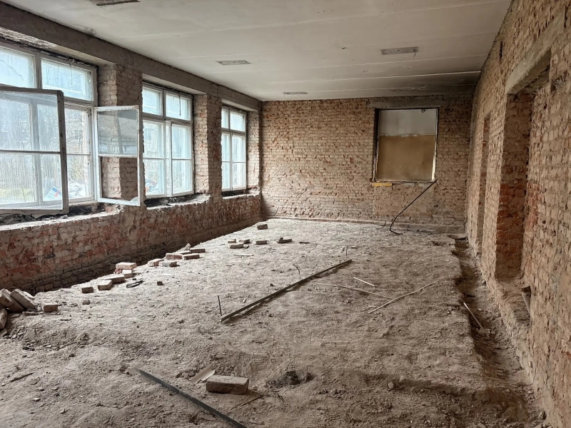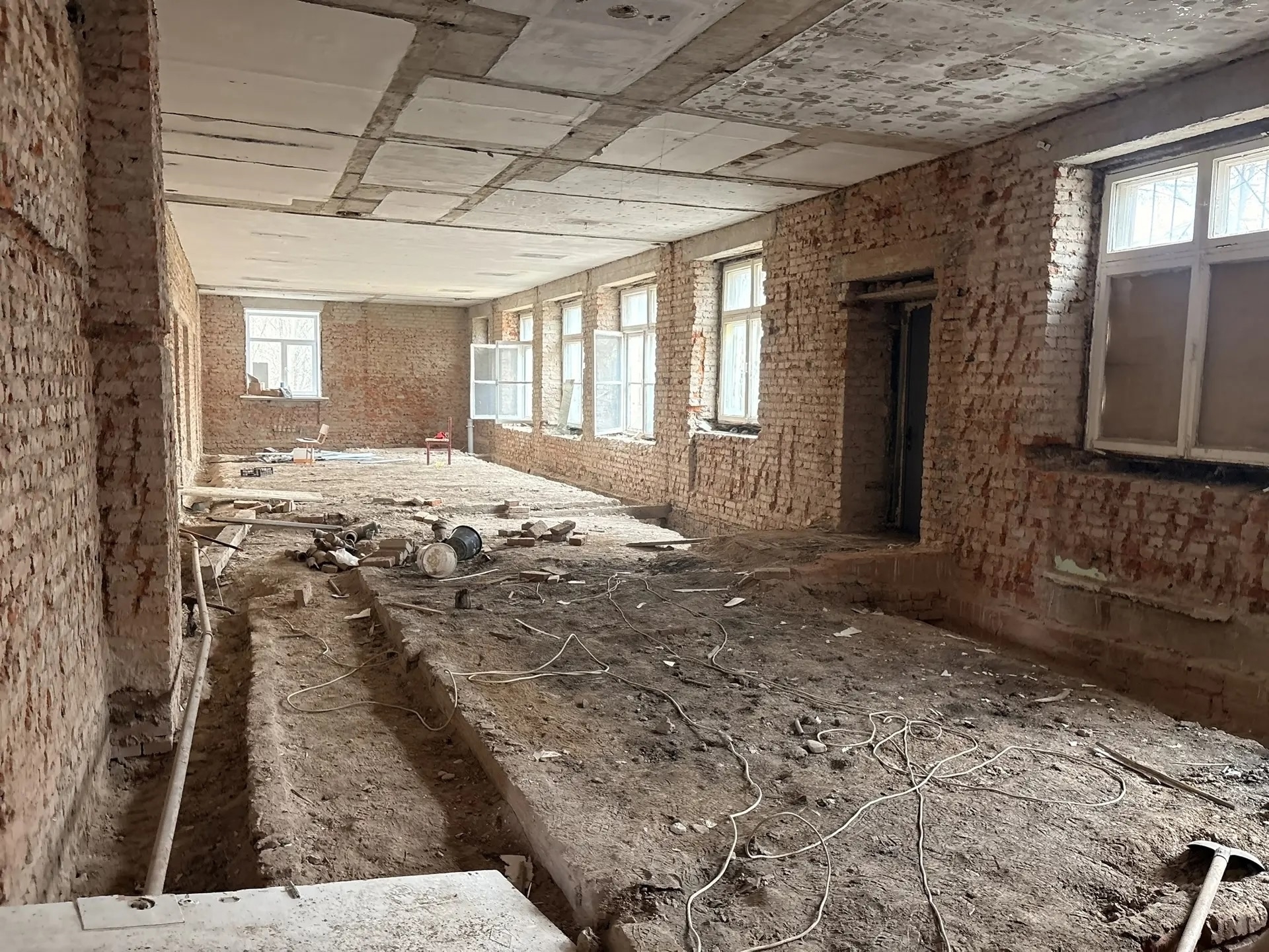 В настоящее время продолжается отбитие штукатурки и слоя цемента от поверхности стен на втором этаже второго корпуса. В первом корпусе на втором этаже подрядная организация приступила к демонтажу дверных коробок, перегородок и пола.